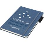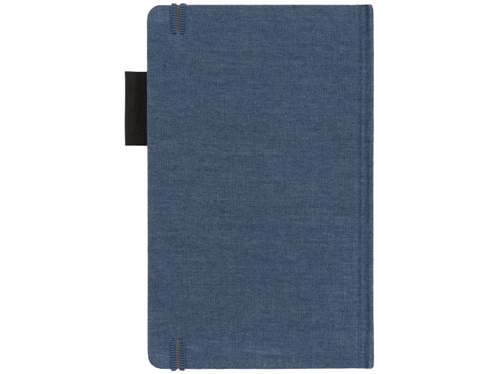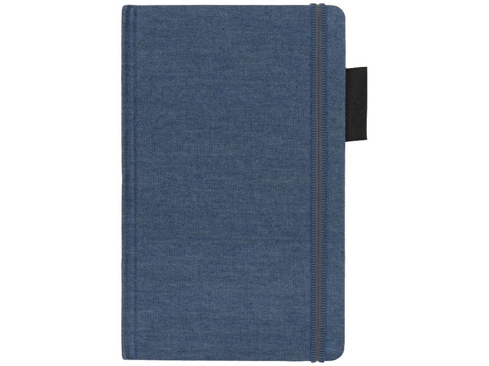 Блокнот Jeans формата A5 из ткани. Блокнот формата A5 с джинсовой тканью, 80 листов линованной бумаги (80 г/м²) кремового цвета, эластичная застежка особого дизайна, лента-закладка и застежка-держатель для ручки. Ткань.