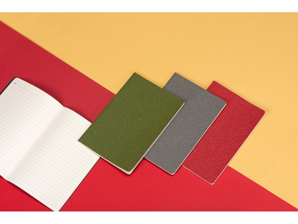 Универсальный блокнот в трендовых оттенках. Обложка матового цвета из переработанного картона с эффектом меланж. Прошитый нитками блок на 60 линованных страниц.