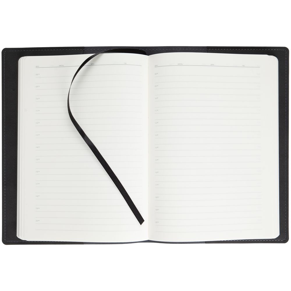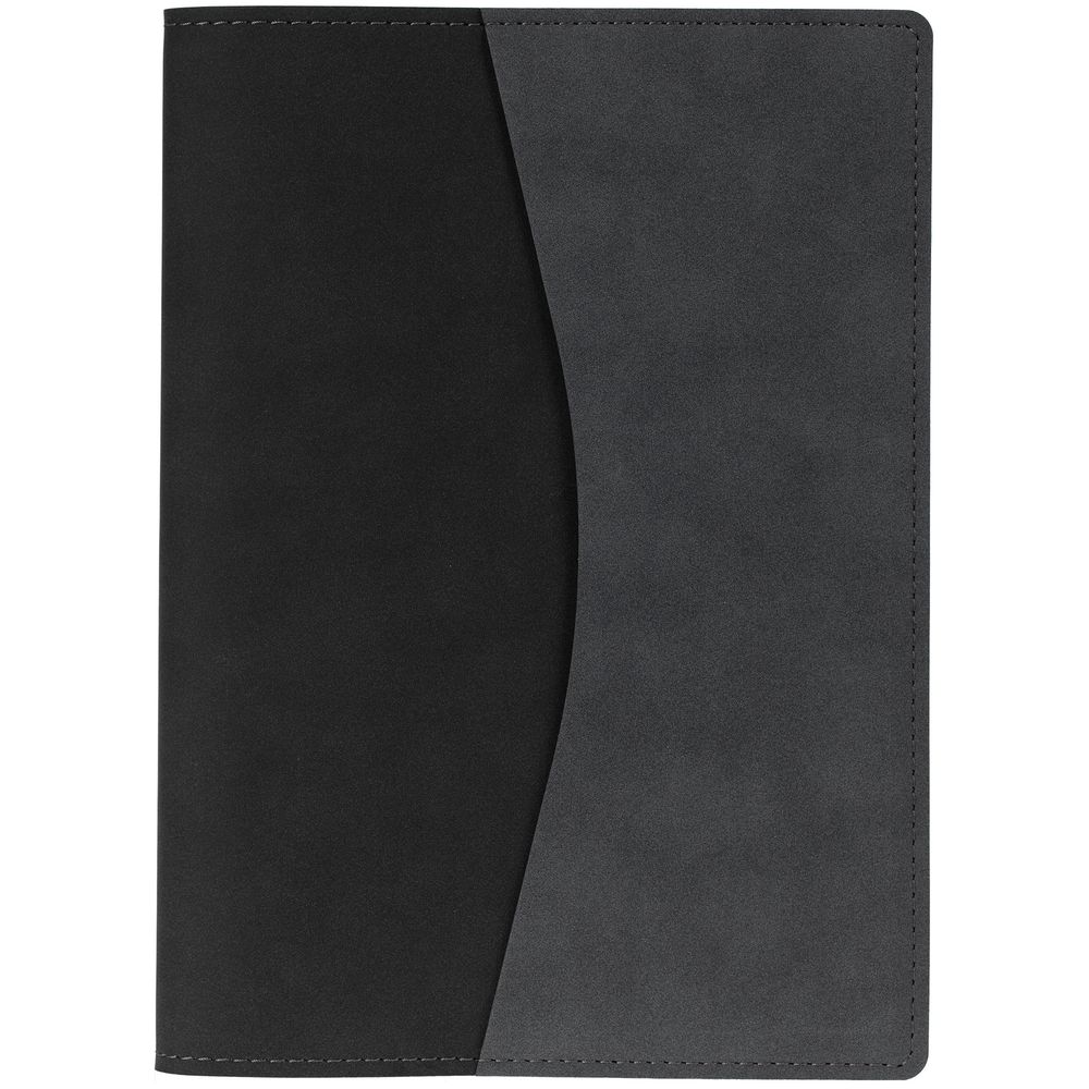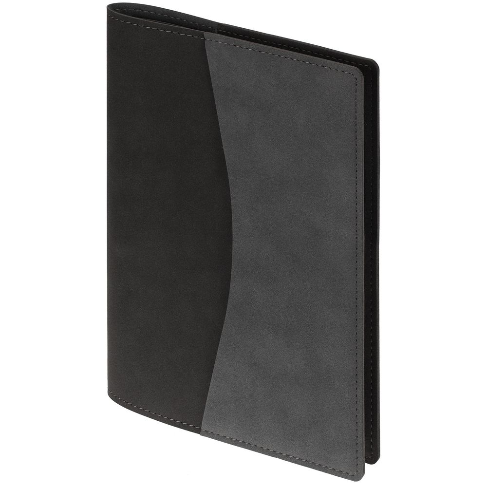 Ежедневник в двусторонней суперобложке, выполненной из материала Nubuck, темно-серый и черный,  дополнен цветным ляссе.