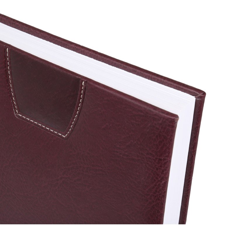 Изделие выполнено в жесткой обложке с тонкой мягкой подложкой. Переплетный материал – искусственная тисненная кожа. Поверхность фактурная, с легким естественным рисунком неглубоких морщинок и прожилок. Имеет мягкий блеск. Верхняя часть обложки декорирована трапециевидной вставкой блестящей мелкозернистой искусственной кожи, в тон основного цвета обложки. По периметру фрагмент зафиксирован контрастной прошивкой белого цвета, играющей также декоративную функцию.
