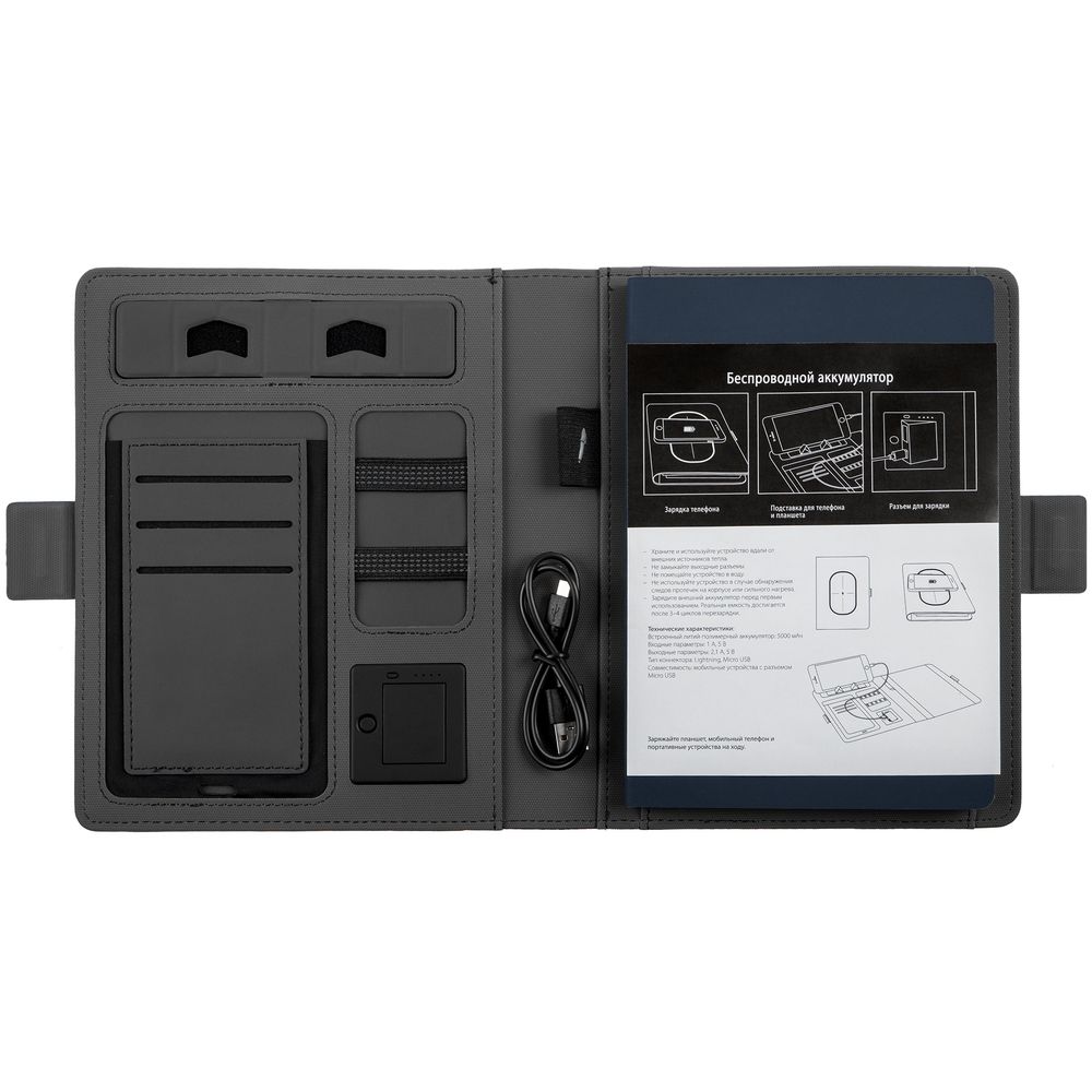 Органайзер с блокнотом и аккумулятором с беспроводной зарядкой.Съемный блокнот формата А5, 64 листа в линейку, тонированная бумага.Встроенный аккумулятор емкостью 5000 мАч (входные параметры: 1 А, 5 В; выходные параметры: 2,1 А, 5 В). Поддерживает функцию беспроводной зарядки (5 Вт)Карман для телефона (до 6")3 кармана для карточекПодставка под телефонПетля для ручкиКрепления-резинки для кабеляОбложка из ткани и магнитная застежкаВ комплекте кабель для зарядки аккумулятора с разъемом Micro USB/Lightning.